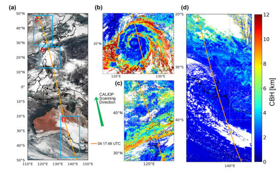 We chose a suitable case to show the performance of the new CBH product. Super Typhoon Meranti approached the southeastern coast of China on 13 September 2016. In particular, we focused on three areas, as shown in Figure 4: the super typhoon (domain B), the high clouds over the Chinese Bohai Rim (domain C), and the low clouds over the southern Australian coast (domain D). This example was selected because it covers a variety of clouds, including deep convective, low, and high clouds. This enabled us to develop a better comprehension of the RF-CBH performance for various cloud types.