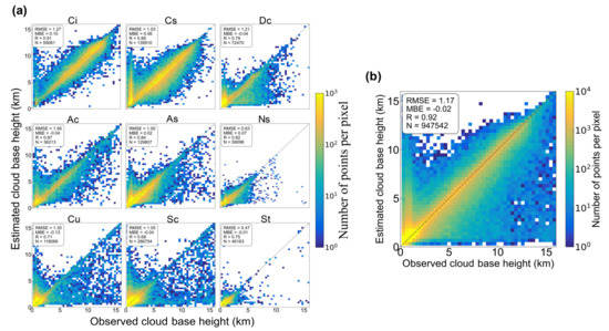 RF-CBH performance: (a) the performance of RF-CBH for different cloud types. Ci: cirrus, Cs: cirrostratus, Dc: deep convection, Ac: altocumulus, As: altostratus, Ns: nimbostratus, Cu: cumulus, Sc: stratocumulus, St: stratus; (b) the performance of RF-CBH for all cloud types.
