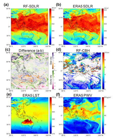 Spatial features of the H-8 full-disk SDLR and RF inputs on 1 September 2018: (a) H-8 SDLR derived using RF models; (b) ERA5 reanalysis SDLR product; (c) the difference between H-8 SDLR and ERA5 reanalysis SDLR product under cloudy-sky and clear-sky conditions; (d) H-8 CBH derived using the RF models; (e) ERA5 reanalysis LST product; and (f) ERA5 reanalysis PWV product.