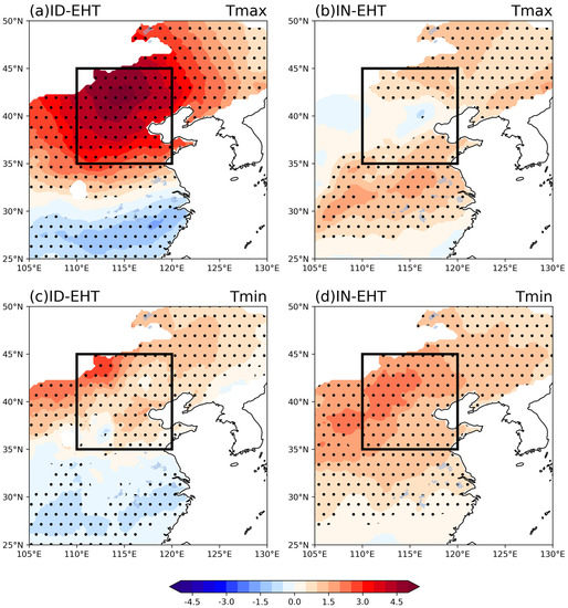 Composite anomalies of Tmax for (a) ID-EHT, (b) IN-EHT; (c,d): the same as (a,b) but for Tmin anomalies (shading; units: °C). Black dots indicate the anomalies significant at the 95% confidence level.