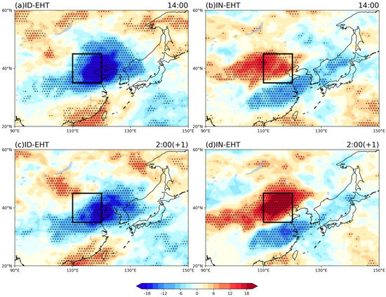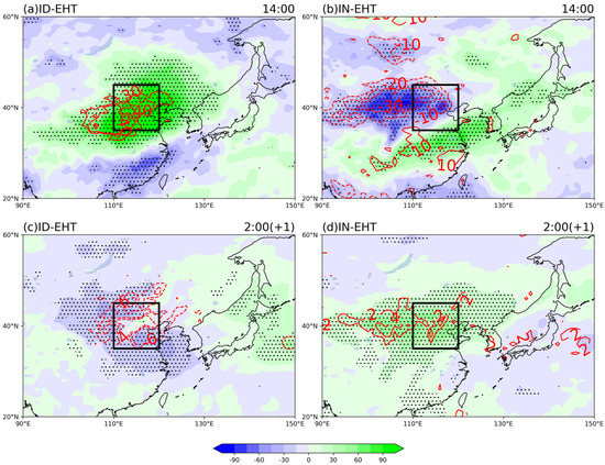 Composite anomalies of total cloud cover (shading; units: %) at 14:00 (a) and at 2:00 of the next day (c) for ID-EHT; (b,d) are same as (a,c) but for IN-EHT. Black dots indicate the anomalies significant at the 95% confidence level.