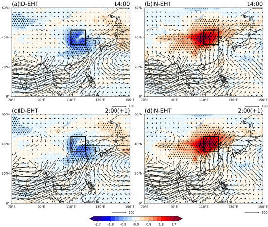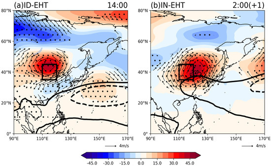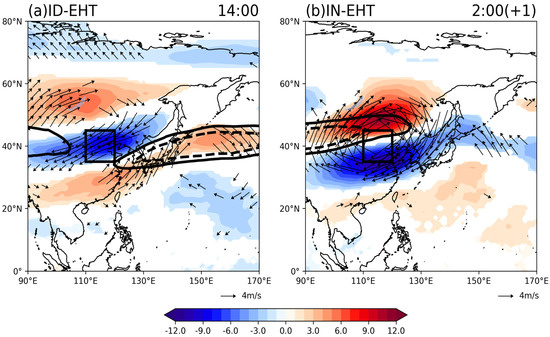 There is an anticyclone anomaly over North China, a cyclone anomaly over South China, and an anticyclone in the southeastern part of North China in the upper troposphere when an ID-EHT occurs (Figure 6a). With the cooperation of such a wind anomaly, water vapor transport from the sea to North China is blocked, resulting in a negative SH anomaly over North China (Figure 4a), indicating that North China is relatively dry. Figure 6b shows that when an IN-EHT occurs, an anticyclone dominates over North China. The spatial scope and intensity of the anticyclones are larger than those of ID-EHT. Its south side extends to South China, and the original cyclone disappears. Under the control of such a wind anomaly, a larger amount of water vapor from the sea surface can be transported to North China, which is conducive to the formation of a stable moisturizing layer over North China during the day.