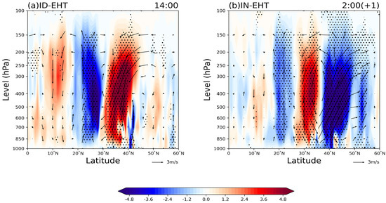 Composite anomalies of meridional vertical winds (arrows, units: pa/s, averaged from 110° E to 120° E, the vertical component is amplified 100 times) and vertical motion (shading, units: pa/s) at 14:00 (a) for ID-EHT and at 2:00 (b) on the next day for IN-EHT. Black dots indicate the anomalies significant at the 95% confidence level.