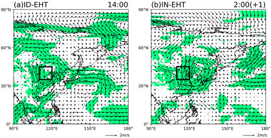Composite anomalies of 850 hPa wind (arrows; units: m/s) at 14:00 (a) on the day for ID-EHT and at 2:00 (b) on the next day for IN-EHT. Green shaded areas indicate that either the zonal or meridional wind anomalies are significant at the 95% confidence level.