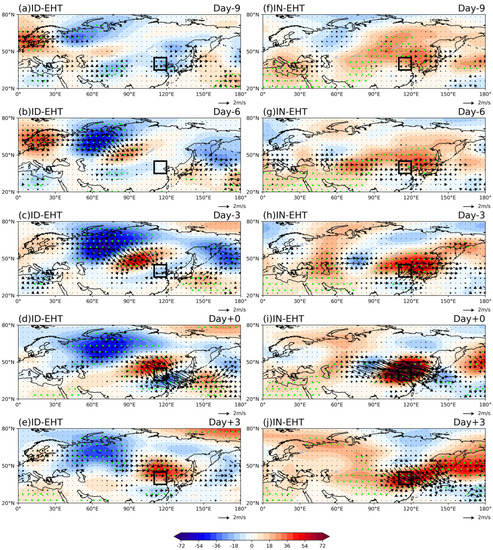 Composite evolution of 200 hPa geopotential height anomalies (shading; units: m) and the 200 hPa wave activity flux (arrows; units: m2/s2) (from day −9 to day +3 for (a–e): ID-EHT, (f–j): IN-EHT). Green dots indicate the anomalies significant at the 95% confidence level.