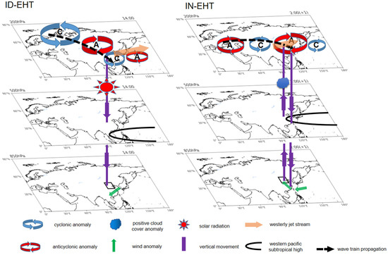 When an ID-EHT occurs, the wave action fluxes from the high-latitude Barents Sea, Kara Sea, and Siberia spread southward to North China to enhance the anticyclone over North China. The southward WPSH is not conducive to the transport of water vapor from the western Pacific to North China, and a weakened WJS leads to a weakening of the East Asian summer monsoon, which leads to less water vapor delivered by the Bay of Bengal to North China. The south-easterly WJS enhances the sinking movement of the anticyclone, which hampers high temperatures at night. This allows North China to absorb more solar radiation during the daytime, coupled with the sensible heat flux from the surface to the atmosphere, causing the daytime EHT. By night, with the low humidity in North China, the heat at night can be dispersed effectively, so no EHT is formed.