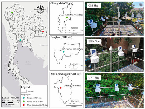 The low-cost PM2.5 sensors were placed at three PCD monitoring stations in Chiang Mai (CM) in the north, Bangkok (BKK) in central and Ubon Ratchathani (URT) in the northeast of Thailand—see Table 1 and Figure 2. Three identical LCS were located next to the PM2.5 FEM instrument sampling probe on the rooftop of each PCD station (~3 m above ground). The FEM instruments were a BAM-1020 (Met One, Grants Pass, OR, USA) at the CM site, an MP101M (ENVEA, Poissy, France) at the BKK site and a T640 (Teledyne, Thousand Oaks, CA, USA) at the URT site. Key specifications of these instruments and the test periods are in Table 1: brief descriptions of the FEMs are in [21]. The FEM instrument at URT was calibrated to the FRM by the National Institute of Metrology (Thailand) [43]; the correlation between FEM and FRM was acceptable with regression equation: y = 1.084x + 4.093 (R2 = 0.94). The data from FEM instruments were collected and provided by PCD. The LCS data were transmitted in real time to our server. The PM2.5 FEM instruments also monitor meteorological parameters, including ambient temperature and relative humidity, and they were used in our LCS calibration. Weather in Thailand is influenced by two monsoon seasons: the northeast monsoon from December to March and the southwest monsoon from May to October [44] and is usually described as falling into two seasons according to the rainfall: the dry season (November to April) and wet season (May to October) [45]. The location characteristics at each sampling site in all these regions is described below.