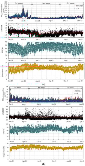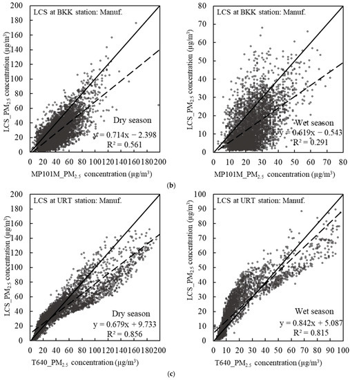 - After MRL calibration, performances of the PM2.5-LCS only at CM during the dry season and URT site during both seasons were acceptable with the CV: 5.76 ± 4.67%–6.84 ± 4.97%, slope: 0.829–0.945, intercept: 1.123–5.492 µg/m3, R2: 0.880–0.934 and RMSE: 4.285–5.102 µg/m3.