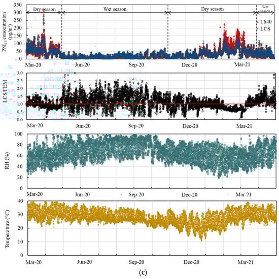 Figure 3 shows the seasonal variation of 1-h PM2.5 concentration from LCS and FEM, ratio of LCS to FEM, RH and temperature at all three sites. Overall, the uncalibrated LCS measurements mostly followed the trend in PM2.5 FEM measurements and responded well to most sudden spikes of mass concentrations. LCS to FEM ratios and meteorological factors (RH and temperature) are also summarized in Table 3. The LCS/FEM ratio during the dry season at CM and URT were close to 1, whereas it was lower at BKK. This indicated that the 1-h averaged ambient PM2.5 levels of uncalibrated LCS at CM and URT matched well, in general, to those obtained from the FEM instruments. However, PM2.5 LCS concentrations at URT during the dry season were lower than those from the T640. This agrees with Hagler et al. [49], who reported that the PM2.5 concentrations from a T640, an optically based FEM, closely matched those from a BAM-1020 instrument at lower concentrations, but overestimated concentrations above ~80 µg/m3. Average RH and temperature during the dry season ranged from 60 ± 15 to 66 ± 12% and 24.4 ± 5.4 to 29.0 ± 2.7 °C, respectively. Average RH during the wet season was significantly higher than those during the dry season (RH increased 9–24%), while temperature was also slightly higher. Average temperatures at CM and URT in the dry season were lower, because it included the winter months (Nov–Feb).