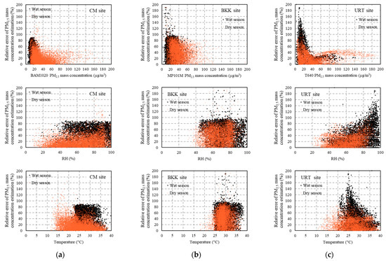The distribution of the relative error of unadjusted LCS are shown in Figure 4. The relative error (%) values were calculated with 1-h averaged data of unadjusted PM2.5 LCS and FEM concentrations. For the concentration range, the highest relative errors for PM2.5 concentrations were observed below 20 µg/m3, while the maximum error values were up to 200%. For the CM and URT sites, between 20–50 μg/m3, the errors were mostly below 100% and they were mostly below 50% when the PM2.5 level went above 50 μg/m3. Values from LCS at BKK were mostly characterized by rather constant maximum relative errors at ~90% independent of the concentration range, RH or T (average: 40.2% for dry and 51.3% for wet). The highest relative errors were found during the wet season at all sites at low concentration (<20 µg/m3), with average PM2.5 concentrations of 16.1 ± 5.5 µg/m3 (CM), 23.6 ± 9.4 µg/m3 (BKK) and 15.4 ± 10.6 µg/m3 (URT). At CM, the relative error during the dry season was clearly increased at a higher RH level. This is consistent with the previous studies by Liu et al. [51] and Jayaratne et al. [33]. The relative error of LCS during the wet season doubled those in dry season at CM and URT. The error during the wet season at CM and BKK were nearly identical, with constant maximum ~90% at RH greater than 42%. The relative error of LSC at URT (average: 23.8% in dry season and 40.0% in wet season) was consistent with most previous studies, which showed that low PM concentration and RH level significantly impacted low-cost PM sensor performance [20,55,56,57]. However, it should be noted that Kosmopoulos et al. [29] reported that the effect of RH on the response of Plantower PMS5003 sensors for fine PM in southeast Europe was negligible, so the measurement location is important to consider. The relative errors of PM2.5 in the present study show no pattern for the influence of temperature levels on sensor performance. It is noted that beta attenuation monitor consists of the heater system with a controller to reduce the RH level of samples. It was normally set below a particular point to remove the hygroscopic and condensation effect of particles on the filter influencing the mass concentration reading. Hence, a range of RH set point is the critical factor to assess the performance of beta attenuation measurement [58,59]. Takahashi et al. [59] reported the PM concentration from BAM was higher than those using the gravimetric method at high RH (>80%). Kiss et al. [60] suggested that 1-h PM10 measurements must be used carefully, as water vapor adsorption/desorption from the beta attenuation monitor’s filter material may cause significant bias at low ambient concentration. Zheng et al. [28] also supported that the beta-attenuation-based monitors have drawbacks at low concentrations.