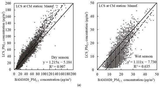 The correlation between 1-h PM2.5 concentration from unadjusted (original) LCS and FEM measurements during the dry and wet seasons are shown in Figure 5. The values of performance metric including precision (CV), bias (slope and intercept), linearity (R2) and error (RMSE) for unadjusted LCS at each site are shown in Table 4. Reproducibility of individual LCS was assessed on the basis of CV. The mean CV for unadjusted LCS at each site during the dry (8.86 ± 7.30% to 14.47 ± 6.80%) and wet season (5.85 ± 3.86 to 12.53 ± 9.58) were at an acceptable level (CV ≤ 30%) of sensor variations. The R2 values from correlation between the unadjusted-LCS and the reference PM2.5 were acceptable at CM during the dry season with R2 = 0.907; however, during the wet season, it was poorer, with R2 = 0.635, due to larger scattering in the PM2.5 concentration at high RH level. The R2 values of LCS vs. FEM at URT during the dry (R2 = 0.856) and wet seasons (R2 = 0.815) were also acceptable with R2 > 0.7, as suggested by U.S. EPA [43]. However, at BKK, the R2 was only 0.561 during the dry season and 0.291 during the wet season. The RMSE values of unadjusted LCS vs. FEM at all sites were also higher than the values suggested by U.S. EPA [43]. Hence, the performance of PM2.5 LCS in Thailand was poor to high (R2 = 0.291–0.907) as compared with FEM instruments. This is consistent with the study of Johnson et al. [27], who reported the performance of LCS with BAM was only moderate to high (R2 = 0.35–0.81). The low performance of LCS could be attributed to the different PM emission sources, low concentration and high RH level. Before calibration, the performance of the LCS only at URT during the wet season was acceptable.