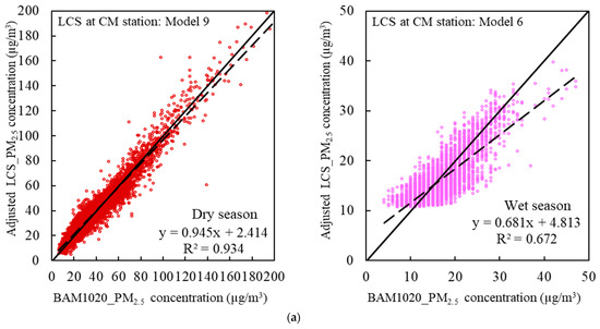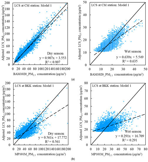Correlation of 1-h PM2.5 concentration between adjusted LCS by MRL models vs. FEM during the (a) dry and (b) wet seasons at CM. The solid line is the line with slope =1 while the dashed line represents the fitting.