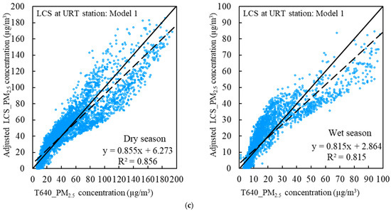 Correlation between LCS LR models and FEM values for 1-h PM2.5 concentration during the dry and wet seasons at (a) CM, (b) BKK and (c) URT. The solid line is the line with slope =1 while the dashed line represents the fitting.
