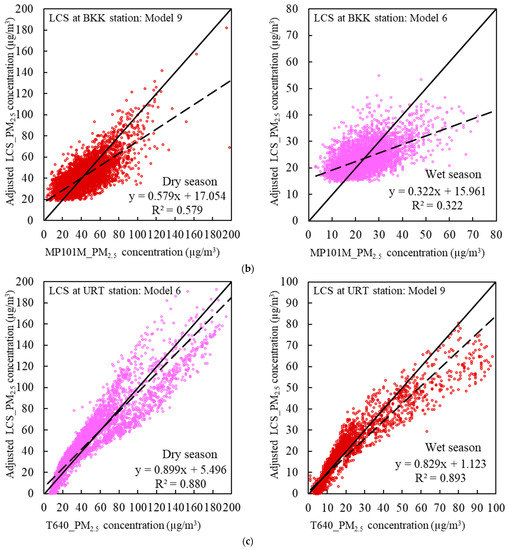 Correlation between LCS and FEM 1-h PM2.5 concentrations using MRL models during both seasons at (a) CM, (b) BKK and (c) URT—model 6: pink scatters, model 9: red points. The solid line is the line with slope =1 while the dashed line represents the fitting.