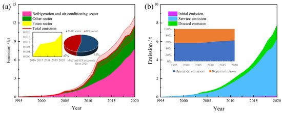 The emissions from various life cycle processes in the refrigeration and air conditioning sector and foam sector were further analysed here. Service emissions increased from less than 1 kt yr−1 in 1995 to 6 kt yr−1 in 2020 and the proportion was always the highest (72–99%) with cumulative emissions of 43 kt (Figure 1b). This was followed by disposal emissions, which increased from less than 1 kt yr−1 in 1995 to 2 kt yr−1 in 2020. The proportion was between 5–27%, and the cumulative emissions were 9 kt. Initial emissions were the lowest, accounting for between 1%–6%, and the cumulative emissions were less than 1 kt. Taking 2016 as an example, the emissions from the initial, service, and disposal stages were 0.05 kt, 4 kt, and 1 kt, accounting for 1%, 83%, and 16%, respectively. For the refrigeration and air conditioning sector, the service emissions included both operational and maintenance emissions, while for the foam sector, the service emissions only included operational emissions. Among the total service emissions in the refrigeration air conditioning and foam sectors, the cumulative emissions in the operating phase and the maintenance phase were 27 kt (63%) and 16 kt (37%), respectively (Figure 1b). It should be noted that the growth rate of disposal emissions has increased year by year since 2002. It can be seen that in order to reduce the HFC-134a emissions in the refrigeration and air conditioning sector, it is necessary to strengthen refrigerant recovery.