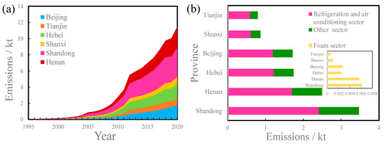 The North China Plain includes four provinces and two municipalities: Hebei, Henan, Shandong, Shanxi, Beijing, and Tianjin. From 1995 to 2020, the HFC-134a emissions were unevenly distributed among provinces in the North China Plain, and the cumulative emissions in Shandong Province were the highest at 29 kt, accounting for 33% of the total cumulative emissions (Figure 3a). Followed by Henan Province, the cumulative emissions were 18 kt, accounting for 17% of the total cumulative emissions. The emissions from these two provinces rose from less than 1 kt yr−1 in 1995 in both provinces to 4 kt yr−1 and 3 kt yr−1 in 2020, respectively. Hebei Province and Beijing had similar emissions patterns, with cumulative emissions of 15 kt and 12 kt, respectively, accounting for 17% and 14% of the total cumulative emissions. The HFC-134a emissions in Shanxi Province and Tianjin were similar, with cumulative emissions of 7 kt (8.3%) and 6.6 kt (7.6%), with both comprising less than 1 kt yr−1 in 2020.
