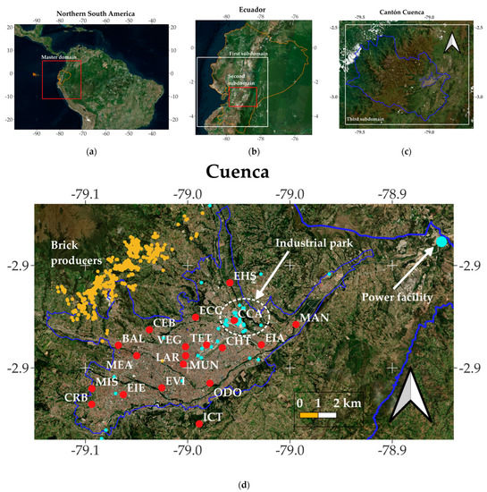 Location of: (a) Ecuador and (b,c) Cantón Cuenca. (d) The urban area of Cuenca (blue border) and the air quality network from Cuenca (red dots). Nomenclature of stations: MUN, Municipio; MAN, Machángara; CEB, Cebollar; BCB, and Bomberos; ICT, Ictocruz; CRB, and Colegio Rafael Borja; MIS, Misicata; EIE, Escuela Ignacio Escandón; EVI, and Escuela Velasco Ibarra; ODO, Facultad de Odontología; LAR, Calle Larga; BAL, Balzay; MEA, and Mercado El Arenal; CHT, Colegio Herlinda Toral; VEG, Vega Muñoz; TET, and Terminal Terrestre; EIA, Escuela Ignacio Andrade; ECC, Escuela Carlos Crespi; CCA, and Colegio Carlos Arízaga; and EHS, Escuela Héctor Sempértegui. Yellow dots indicate the artisanal brick producers. Cyan dots indicate industries.