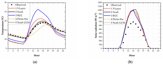 The 2 Noah land surface scheme was better when modeling surface temperature, followed by the 4 Pleim–Xiu scheme (Table 5). These options received the GE, MB, and IOA metrics into the corresponding value benchmark ranges. The 2 Noah option reproduced, in the best way, the mean daily profile (Figure 3a). On average, the 4 Pleim–Xiu option underestimated the surface temperature between 09:00 to 16:00 local time (LT) (MB = −0.5 °C). In addition, a strong relationship between measured and modeled temperatures (IOA = 0.9 and 1.0) was established for these two schemes. The 2 Noah scheme captured the highest percentage (78.0%) of the hourly temperature records (Table 6). The 1 5-Layer and 3 RUC options underestimated the temperature during the first hours of the day and then overestimated it during most of the daylight hours. The 5 Noah UCM option modeled the mean temperature profile well during the morning, as well as during the first hours of the afternoon (Figure 3a). However, this option underestimated the temperature during the hours without solar radiation.
