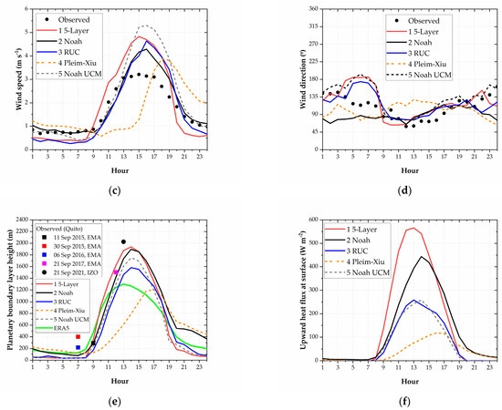 Atmospheric monitoring is scarce in Ecuador, especially for parameters such as the planetary boundary layer height [42,43,45]. We did not find PBLH records from Cuenca. However, five observations of this parameter were measured in Quito, which we preliminary used as a reference. Regarding this, the 2 Noah scheme also provided consistent modeled values of the planetary boundary layer height. In short, more surface and vertical observations will be required in the Andean region of Ecuador for complete assessments of numerical models.