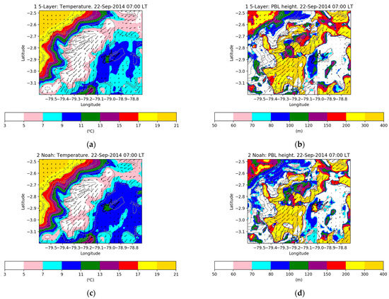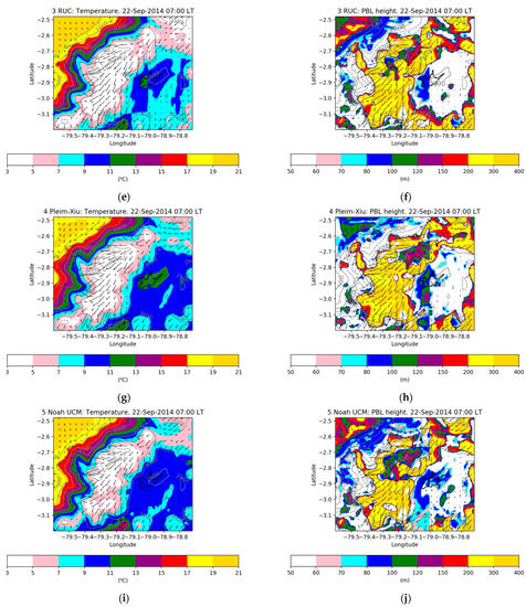 Modeled temperature and planetary boundary layer height on 22 September 2014 (07:00 LT): (a,b) 1 5-Layer; (c,d) 2 Noah; (e,f) 3 RUC; (g,h) 4 Pleim–Xiu; (i,j) 5 Noah UCM.