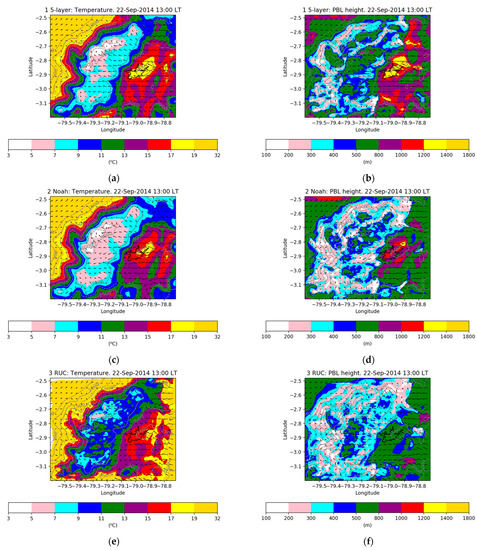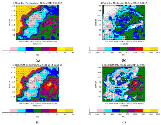 Modeled temperature and planetary boundary layer height on 22 September 2014 (13:00 LT): (a,b) 1 5-Layer; (c,d) 2 Noah; (e,f) 3 RUC; (g,h) 4 Pleim–Xiu; (i,j) 5 Noah UCM.