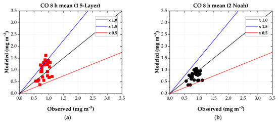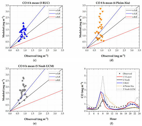 The 2 Noah scheme was best fitted to model the maximum CO daily 1 h mean and the CO daily 8 h mean concentrations (Figure 6b). This scheme also correctly described the mean daily profile during peak CO concentrations (Figure 6f), whereas the other land surface options overestimated the maximum CO levels. On average, the 5 Noah UCM overestimated up to 3.6 mg m−3 of the CO level at 08:00 LT. The 2 Noah scheme received the best metrics for modeling CO concentrations (Table 7). However, this option received no solid linear relationship between the recorded and modeled values (r = 0.41 and r = 0.38, for the maximum CO daily 1 h mean and CO daily 8 h mean, respectively). The 2 Noah option presented the highest percentages of captured records (92.6% for the maximum CO daily 1 h mean, and 100.0% for the maximum CO daily 8 h mean (Table 8). The 5 Noah UCM option showed the lowest performance due to its overestimating the peak CO levels.