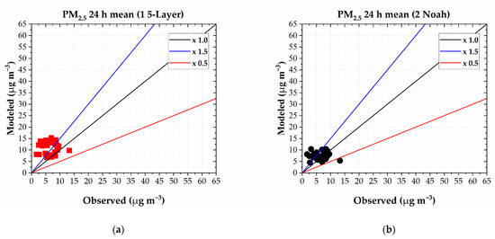 Although somewhat overestimated, the 2 Noah option showed the best performance for modeling the 24 h PM2.5 mean concentrations (Figure 7), which were overestimated by the other options. All the land surface schemes show a weak linear correlation between the recorded and modeled values. The 2 Noah option presented the highest percentages of captured records (63.0%, Table 8). The 5 Noah UCM showed poor performance, whereby it overestimated, to a high degree, the PM2.5 levels (Figure 6e,f) (MB = 26.7 µg m−3).