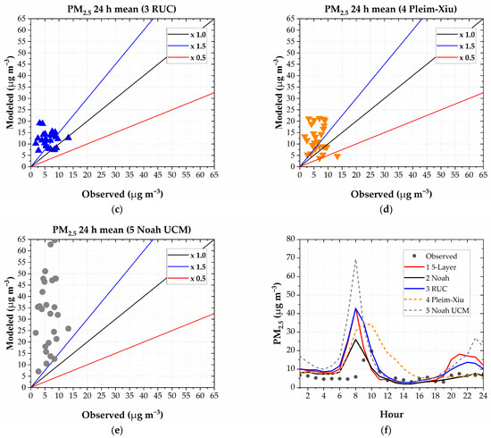 Observed versus modeled daily PM2.5 24 h mean at the MUN station: (a) 1 5-Layer; (b) 2 Noah; (c) 3 RUC; (d) Pleim–Xiu; (e) 5 Noah UCM. (f) The mean daily profile of hourly PM2.5 concentrations.