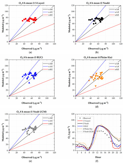 Observed versus modeled daily O3 8 h maximum mean at the MUN station: (a) 1 5-Layer; (b) 2 Noah; (c) 3 RUC; (d) Pleim–Xiu; (e) 5 Noah UCM. (f) The mean daily profile of hourly O3 concentrations.