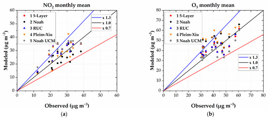 Regarding the NO2 monthly mean concentrations, the 2 Noah scheme captured 93.3% of the records from all passive stations, followed by the 1 5-Layer and 3 RUC options, which captured 80.0% of the records (Table 8, Figure 9a). The 1 5-Layer, 3 RUC, and 5 Noah UCM options adequately modeled 93.8% of the O3 monthly mean concentrations, whereas the 2 Noah and 4 Pleim–Xiu schemes captured 56.3% of the records from the passive stations.