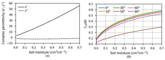 Complex permittivity under different soil moisture (a) and the relationship between soil moisture and reflectivity at the different signal incidence angle (b).