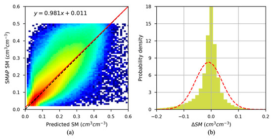 Density scatterplot of GNSS-R derived SSM and SMAP SSM (a) and probability density distribution of inversed SSM deviation (b).