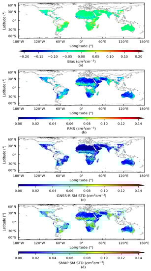 Bias (a) and RMS (b) of GNSS-R retrieved SSM, STD of SMAP SSM (c) and GNSS-R inversed SSM (d).