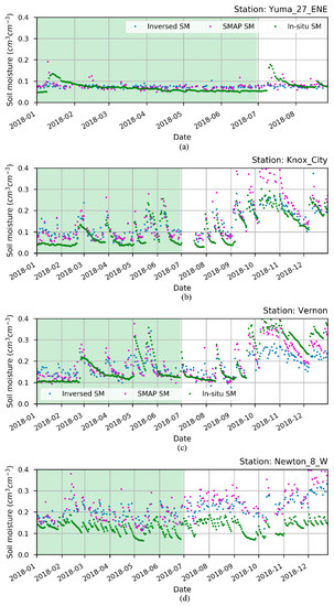 Time series of inversed SSM, SMAP SSM, and in situ SSM comparison at in situ SSM stations Yuma-27-ENE (a), Knox City (b), Vernon (c), and Newton-8-W (d).