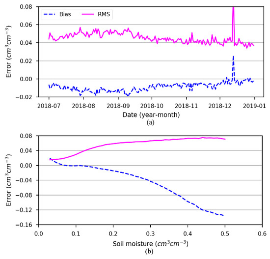 Testing data daily error statistic (a) and total retrieval error at different soil moisture bins (b).