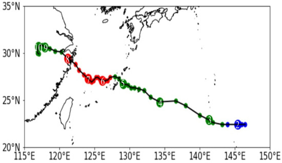A typhoon is a mature tropical cyclone that forms on the tropical or subtropical sea at a surface temperature over 26 °C–27 °C [1]. Generally, in the summer season, the northwestern Pacific Ocean will generate a lot of violent storms called a typhoon. Some will disappear into the sea, and others landfall over the coast to produce a drastic impact through powerful winds and torrential rain [2]. Because of the severe damage caused by typhoons, meteorologists and oceanographers have been studying the cause and influence of typhoons extensively. Ocean–atmosphere interactions in cold sea surface temperature (SST) regions formed in the trail of two typhoon events [3]. Typhoons can induce cooling wakes at the ocean surface, causing lower SSTs along their track [4]. Different SSTs near the typhoon center result in differences in the atmospheric wind field and influence the intensity and typhoon track to some extent, with a significant impact on precipitation and latent heat flux near the eye [5,6,7]. The high-resolution WRF (Weather Research and Forecast) model coupled with the POM (Princeton Ocean Model) reproduces the features of the ocean [8]. Typhoons obtain energy from the warmer ocean and intensify if higher heat and moisture fluxes subsist [9]. Typhoons are illustrated by intense cyclonic winds, well-organized deep convection, and spiral rain bands.