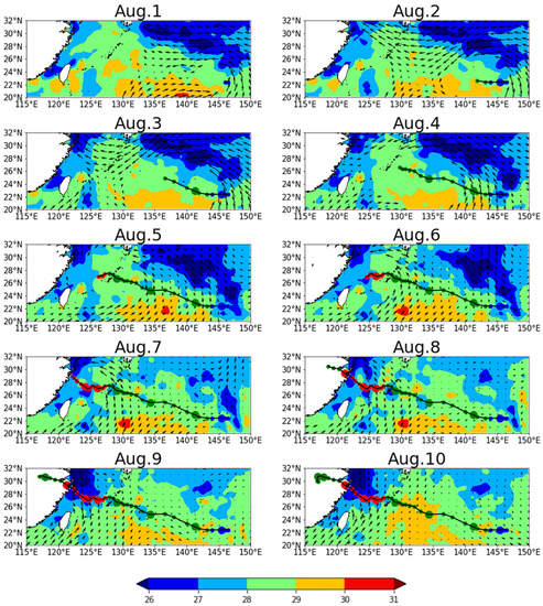 Owing to the higher intensity of the typhoon, a strong upwelling and cooler SSTs occurred in the coastal waters (Figure 1). However, there was an obvious drop in SST on the left of the typhoon track. After the Typhoon’s landfall on 8 August, there was SST cooling along the coastal area of eastern China. Ekman transport brought the subsurface colder water to form an upwelling. A noticeable change in SST could be observed for several days after typhoon landfall because the rate of upwelling was slow ( m/s). On 9 August and 10 August, SST near the coastal area dropped more than 3 °C while the volume transport was not so apparent. This was a delayed effect caused by slower upwelling. On 11 August, SST over the ocean areas increased to 29 °C, and there was no specific Ekman transport observed over the ocean.