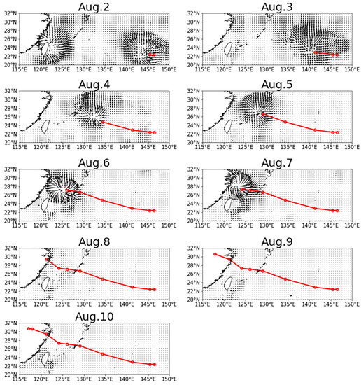 On 2 August, we observed two intense areas of Ekman transport, one at the Typhoon Haikui generated area and another on the Taiwan coast where Typhoon Damery made landfall. However, the intensity of Ekman transport was not predominant. When we compare Figure 4 with Figure 2, lower SSTs were found in the areas of Ekman transport. On 3 August, the Ekman transport was due to Typhoon Haikui. On 4 August, the Ekman transport enhanced because the typhoon intensity increased, SST cooling happened, and the extent of the area extent increased. On 5 August, it was the first time Ekman transport had appeared on both sides of the typhoon track due to the increase in Haikui’s intensity. In the northern hemisphere, the water mainly moves to the right side of the wind due to the Coriolis effect. However, there was more transport to the right side of the typhoon track than on the left side, which indicates that upwelling and SST cooling due to the typhoon’s passage above the ocean. On 6 August, the intensity of Ekman transport increased, leading to a strong upwelling. Meanwhile, the volume of transport was less than the day before. On 7 August, Typhoon Haikui entered the coastal waters of eastern China.