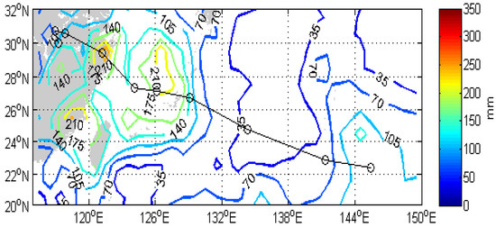 A typhoon’s induced rainfall magnitude and distribution are often multiscale and affected by many factors, such as storm size, track, translation speed, etc. Rodgers et al. [10] did quantitative research on the contribution of the North Atlantic Tropical Cyclone to rainfall. The objective method they used to separate tropical cyclone precipitation was with a fixed radius (444 km) around the center of a tropical cyclone. Yao Lina et al. [11] also used this method to analyze the precipitation after Typhoon Haikui faded. SST increases before a typhoon whereas the precipitation rate increases after a typhoon passes, which means the SST increase before typhoon occurrence prepares the required energy and causes additional precipitation in subsequent days [12]. Rainfall associated with a typhoon can become asymmetric after landfall. Typhoon landfall precipitation forecast is complex due to the coastal and inland topography, land surface, and boundary layer conditions [13,14]. The precipitation that occurs due to typhoons will be variable. The rainfall on the left side of the typhoon track is higher than on the right side of the track [15], which enhances cooling on the left side. Owing to the heavy wind speed around the typhoon, higher wind stress will produce upwelling, and Ekman transport will be higher.
