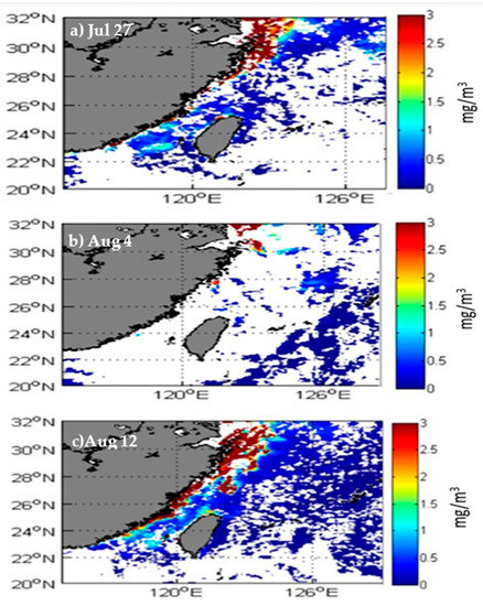 Furthermore, to analyze the post- typhoon effects on chlorophyll concentration, MODIS Aqua-Weekly Ocean Color data on chlorophyll-a concentration were obtained; the chlorophyll data are plotted and presented in Figure 7. Figure 7a describes the chlorophyll variations before the typhoon (27 July), Figure 7b during the typhoon period (4 August), and Figure 7c illustrates the post-typhoon (12 August) period. Chlorophyll concentrations were high along the coastal area in Figure 7a,c, representing before and after the typhoon’s landfall. Before the Haikui Typhoon landed, the chlorophyll concentration was high along the shore due to the landfall of another typhoon, Damrey, and then decreased during the Typhoon Haikui period; later chlorophyll became high again after the Haikui landfall on 12 August. Typhoons have a delayed effect on chlorophyll concentrations, with an average delay of 5.94 days [19].