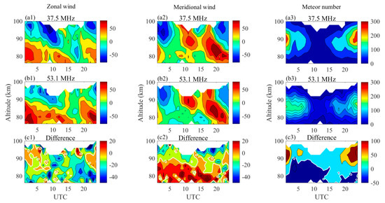 Diurnal variations and their comparisons of wind fields and meteor counts observed by two meteor radars on 1 January 2014; (a1–c1) are, respectively, the zonal wind of two meteor radars and their difference; (a2–c2) are, respectively, the meridional wind of two meteor radars and their difference; and (a3–c3) are, respectively, the meteor count of two meteor radars and their difference.