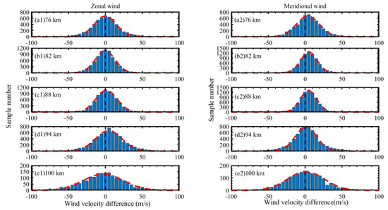 Furthermore, a statistical analysis of the wind field difference between the two meteor radars at different altitudes is given in Figure 6. The horizontal axis represents the wind field difference, and the vertical ordinate represents the sample number corresponding to the wind field difference. As shown in Figure 5, the meteor counts detected by the two radars increase with altitudes from 76 km; meanwhile, the sample numbers with small wind field differences also increase with the altitudes in Figure 6, and the proportion of samples with small wind field differences in the total samples also increases. The meteor counts detected begin to decrease with altitudes from 88 km, sample numbers with small wind field difference gradually decrease, and the proportion of samples with small wind field differences in the total samples also gradually decreases. Therefore, the more meteors detected, the smaller the differences in the wind field between the two radars, and the closer to the true average wind field. Therefore, it can be considered that the meteor count is the main system error of the wind fields retrieved by the two radars.