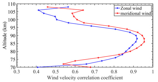 The correlation coefficients of meridional and zonal winds observed by two meteor radars (the blue line shows the correlation coefficient of zonal wind, and the red line shows that of meridional wind).