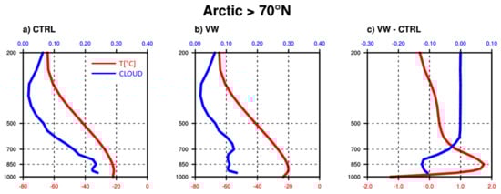 Vertical profiles of temperature (red) and COSP cloud fraction (blue) averaged over the Arctic during winter obtained from (a) CTRL, (b) VW, and (c) difference between VW and CTRL.