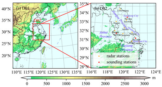 The study area and WRF (Weather Research and Forecasting Model) double nesting domains of (a) D01 and (b) D02. The blue stars denote the location of the used S-band radar. The red X denotes the location of the sounding stations.
