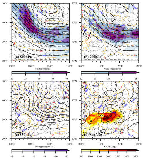 Synoptic features of (a) 500 hPa, (b) 700 hPa, (c) 850 hPa and (d) surface, with wind barbs (half lines, full lines and flags donate 2 m/s, 4 m/s and 20 m/s, respectively), temperature (orange lines, units in °C), wind speed ((a,b), shading), geopotential height ((a–c), bold black lines), mean sea level pressure ((d), bold black lines), divergence ((c), shading) and convective available potential temperature (CAPE, (d), shading) at 0600 UTC (Coordinated Universal Time) on 30 April 2021.