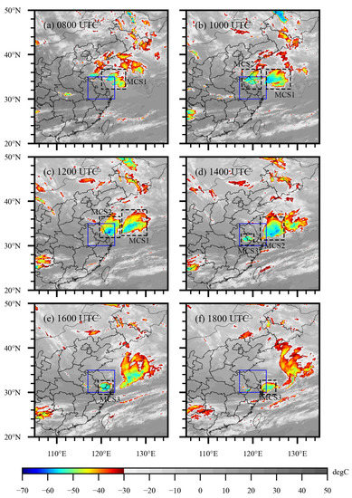 TBB (Black Body Temperature, units in °C) detected by FY-4A (Feng-Yun 4A) AGRI (Advanced Geostationary Radiation Imager) infrared band at 10.8-μm during the hail process, with a 2-h interval. The blue rectangles are the boundaries of Figure 5. The black rectangles indicate the locations of the MCSs (Mesoscale Convective Systems).