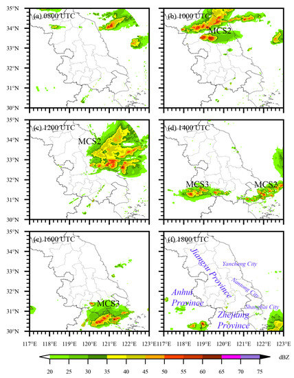 Here, a MCS is defined as a cluster of low IR temperature (below −32 °C) with a major axis of 100 km or more. Figure 4 demonstrates the evolution of MCSs associated with this hailstorm event from 0800 UTC to 1800 UTC by using the TBB (Black Body Temperature) in 10.8-μm infrared band derived from the AGRI (Advanced Geostationary Radiation Imager) of the FY-4A (Feng-Yun 4A) geostationary satellite. The sub-satellite point was at 104.7° E and the geometric correction was done. The parallax effect was not considered. However, the position offset can be neglected according to radar imagery (Figure 5). At 0800 UTC, MCS1 had already formed over the East China Sea, with a TBB below −55 °C (Figure 4a). However, MCS1 did not directly affect eastern China. At 1000 UTC, MCS1 and MCS2 are developing rapidly. MCS2 with TBB lower than −55 °C in the northern region of Jiangsu province was rapidly strengthening as it moved southeast (Figure 4b). About two hours later, this intensified MCS2 began to affect the coastal areas of Jiangsu province at 1200 UTC, with the lowest TBB value reaching −60 °C (Figure 4c), causing severe hailfalls and disastrous winds. Subsequently, MCS2 continued to move eastward and affected Shanghai about four hours later at 1400 UTC with its low TBB tail (Figure 4d); at the same time, a new MCS3 generated at 1300 UTC and then intensified to affect the border of Anhui and Jiangsu province at 1400 UTC, with the lowest TBB about −50 °C (Figure 4d). At 1600 UTC, MCS2 moved eastward into the sea, rapidly weakened. MCS3 maintained its intensity (Figure 4e). MCS3 weakened and moved eastward into the sea at 1800 UTC, with only a few isolated convective cells left on land (Figure 4f).