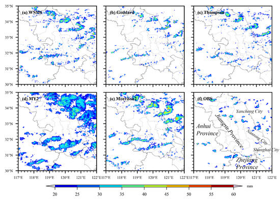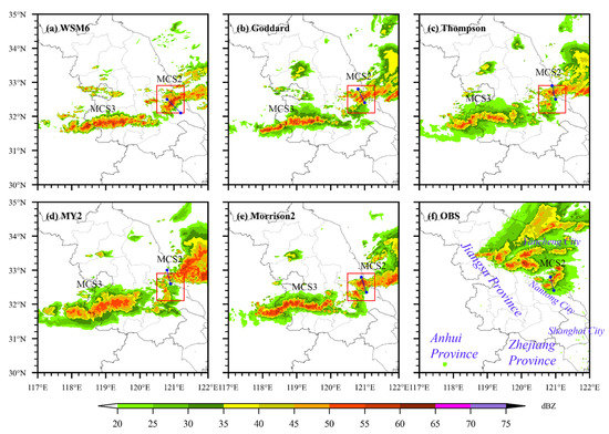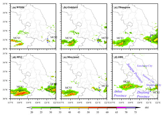 The following radar reflectivity and cross-section interpolation were calculated by python’s package wrf-python [41]. Figure 6 compares the composite reflectivity fields simulated by WRF using five different microphysics schemes against radar observations at 1100 UTC when the simulated MCS2 reached its peak intensity and started to affect the east of Jiangsu province. All simulations basically captured the strong MCS2, along with the squall line that swept through the eastern Jiangsu, although it appeared one hour earlier than observation. In addition, the most pronounced difference between the simulation and observation is that the MCS3 and the associated newly generated squall line (the western part in Figure 6) at the border between Jiangsu and Anhui province appeared at 1100 UTC in the simulation, which was two hours earlier than the observation. This early initiation of convection could be caused by the impact of the convective parameterization scheme in the outer domain (Liang et al., 2019) [19], or the inherent problem of convection-permitting simulation in the inner domain with too frequent occurrence of convection (Zhu et al., 2018) [42].