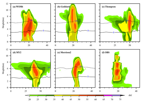 The model simulations of the reflectivity pattern and vertical structure were also concluded: (1) The WSM6 scheme was able to capture the maximum reflectivity core (55–60 dBZ), compared to other schemes. However, it overestimated the intensity of reflectivity near the ground (Figure 9a). (2) The Goddard, Thompson, MY2 and Morrison2 schemes underestimated the maximum reflectivity. Goddard performed the worst among them because its maximum reflectivity core was too high, at over 8 km (Figure 9b). Thompson performed better in echo top and maximum reflectivity near the ground. Its high-reflectivity column (50–55 dBZ) between 3–8 km was consistent with observations (Figure 9c).